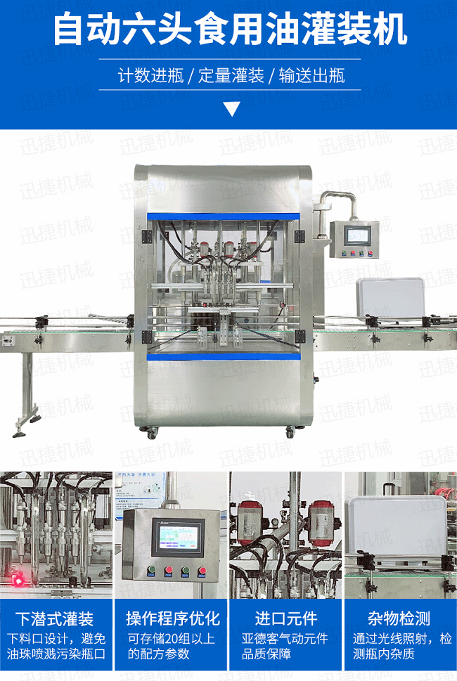 橄榄油灌装旋盖成套设备采用伺服柱塞式计量灌装原理,适用于各种规格(0.1-1升可兼顾到2升灌装)的南瓜籽油、榛子油、牡丹籽油、芝麻油、核桃油、山茶油、亚麻籽油、棉籽油、橄榄油、大豆油、玉米油、菜籽油等食用油灌装。设备采用伺服系统定量推料,在人机界面数字化调节计量,并且可设定100ml或200ml等所需计量,触摸屏一触即达,而且可以单头微调计量。操作简单,维护方便,节省人工成本,生产效率更高。