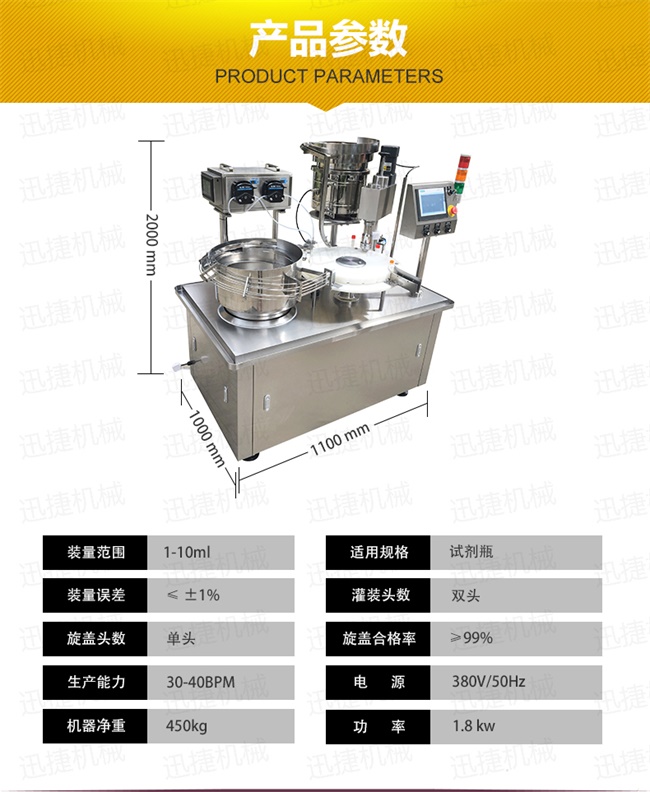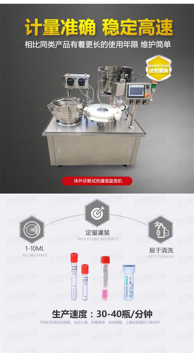 本机是在引进和吸收国外技术的基础上,由我公司自主研发的一款IVD诊断试剂灌装旋盖一体机,能同时完成自动理瓶、自动上瓶、定量灌装、自动理盖、上盖和旋盖封口等动作。本机采用日本高精度封闭式凸轮分度工位器,精度高,运行可靠,使用寿命长。该分度器结构简单,长期使用无需维修。该型号设备主要用于ⅣD体外诊断试剂制药、生物制药行业及科研领域装。机器设计紧凑合理、外形简洁美观,灌装量调节方便。