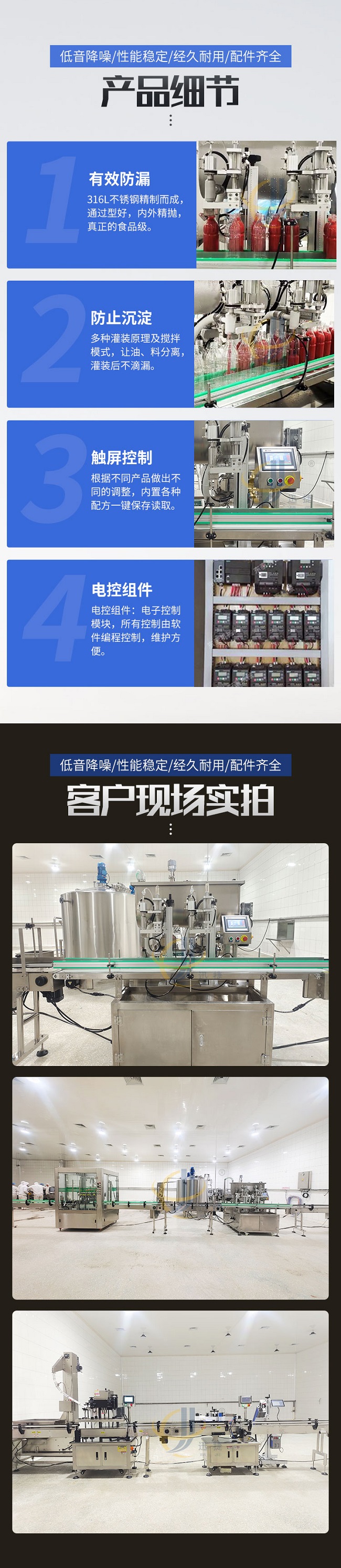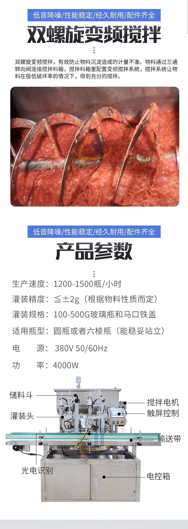 这款柱塞式辣椒酱灌装机低音降噪、性能稳定、经久耐用、配件齐全,适用范围广泛用于辣椒酱、拌面酱、豆瓣酱、大块肉酱、油辣酱、番茄酱花生酱、草莓酱等酱料的定量充填分装。双螺旋变频搅拌,有效防止物料沉淀造成的计量不准。物料通过三通转向阀连接搅拌料箱,搅拌料箱里配置变频搅拌系统,搅拌系统让物料在极低破坏率的情况下,得到充分的搅拌。