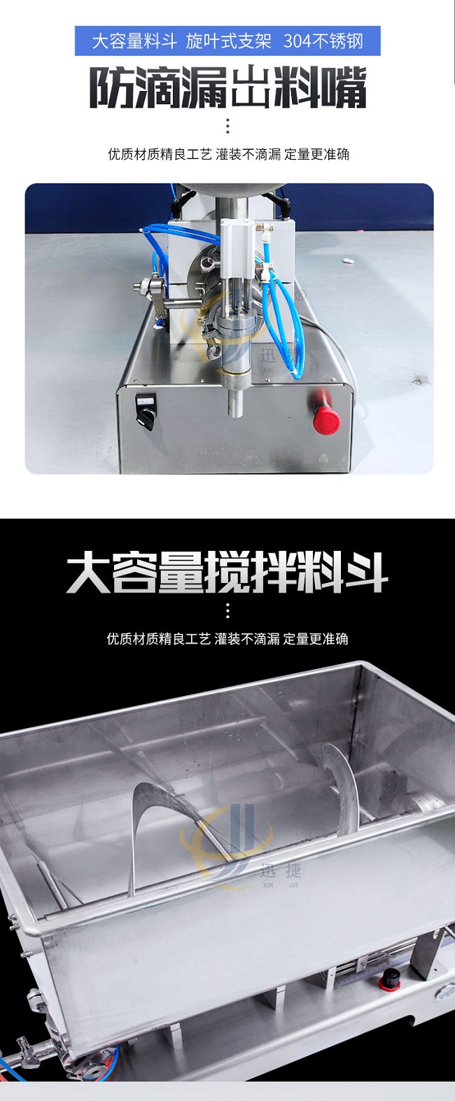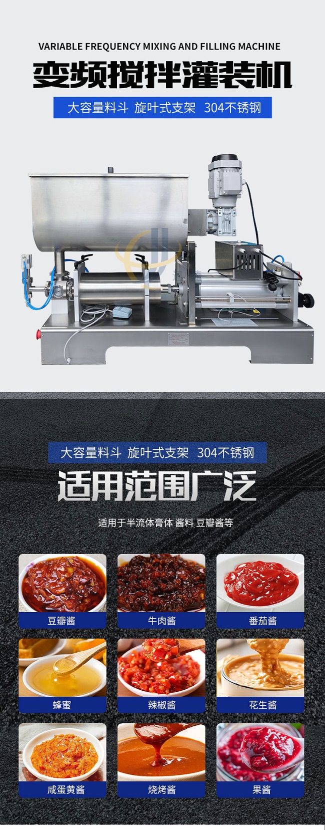 变频搅拌酱料灌装机采用大容量料斗、旋叶式支架、304不锈钢,适用范围广。