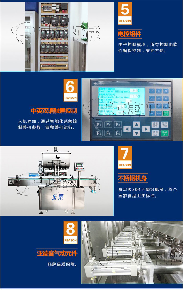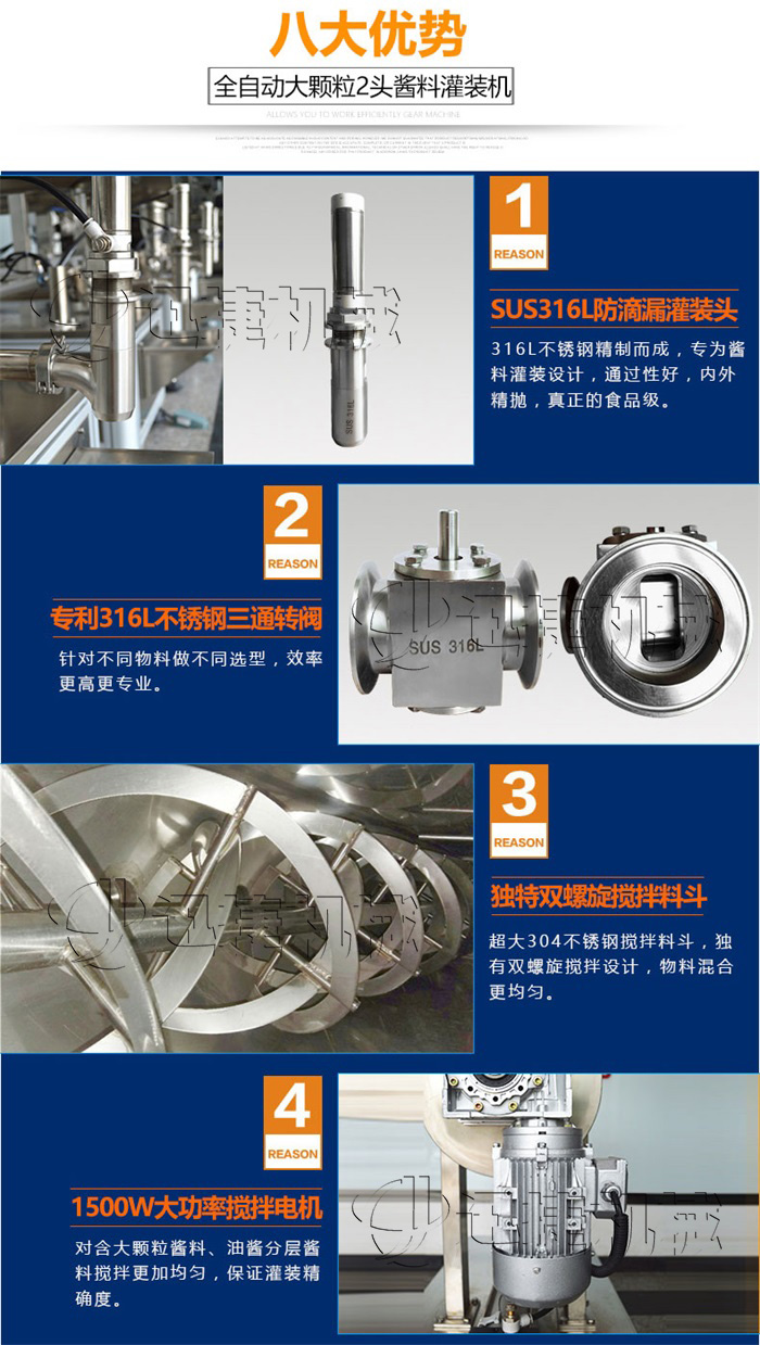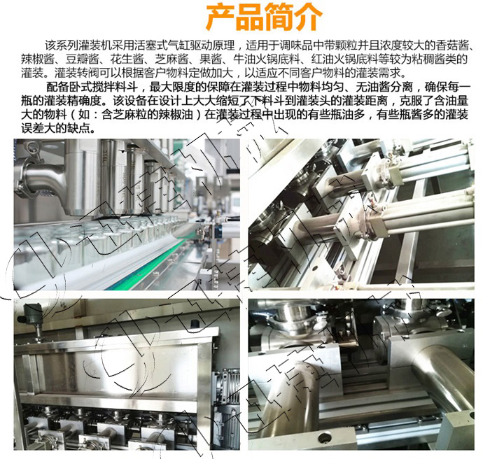 该系列灌装机采用活塞式气缸气动原理,适用于调味品中带颗粒并且浓度较大的香菇酱、辣椒酱、豆瓣酱、花生酱、芝麻酱、果酱、牛油火锅底料、红油火锅底料等较为粘稠酱类的灌装。灌装转阀可以很具客户物料定做加大,以适应不同客户物料的灌装需求。
