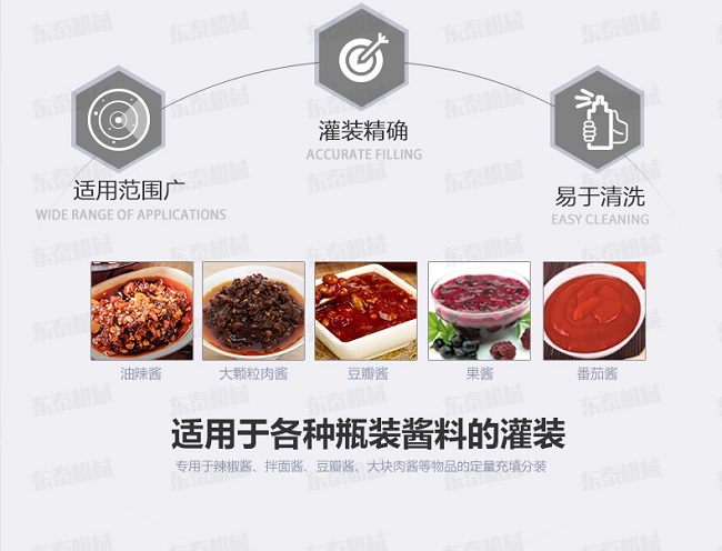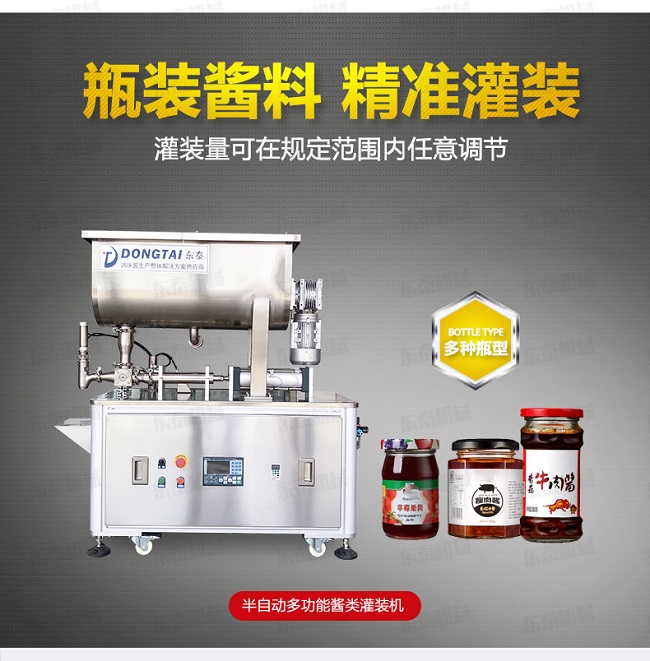 辣椒酱灌装机是由我公司自主研发,卧式搅拌,可以很好的解决大颗粒物料灌装过程中油料分离过快而导致的灌装误差大等难题。主要适用于粘稠酱料,如麻辣酱、香辣酱、牛肉酱、豆辨酱、黄豆酱、豆豉酱等酱料产品。在包装过程中,海鲜酱灌装机可以实现产品从原料进入到包装机械开始,经过一些列生产活动构成的路线,从而达到无人化自动包装。如果您有需要,可以和我们联系