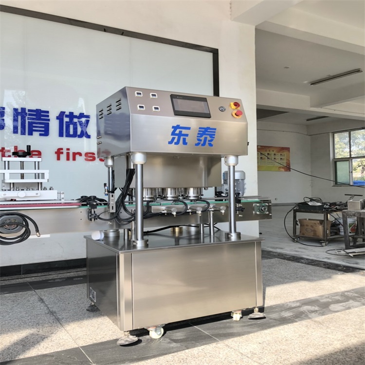 开动设备,把托架降到低点,然后把包装瓶放置到托架上,松开螺母让托架上升,调整好瓶盖和压盖头的距离即可。